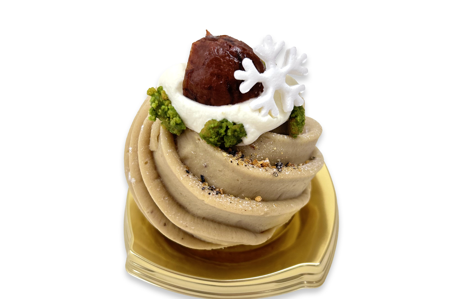 和栗のモンブランクリームの中は生クリームとカスタードクリーム、ごろっと和栗をいれました。仕上げにも和栗の甘露煮・抹茶サブレ・黒豆をトッピングした当店自慢の贅沢モンブラン。