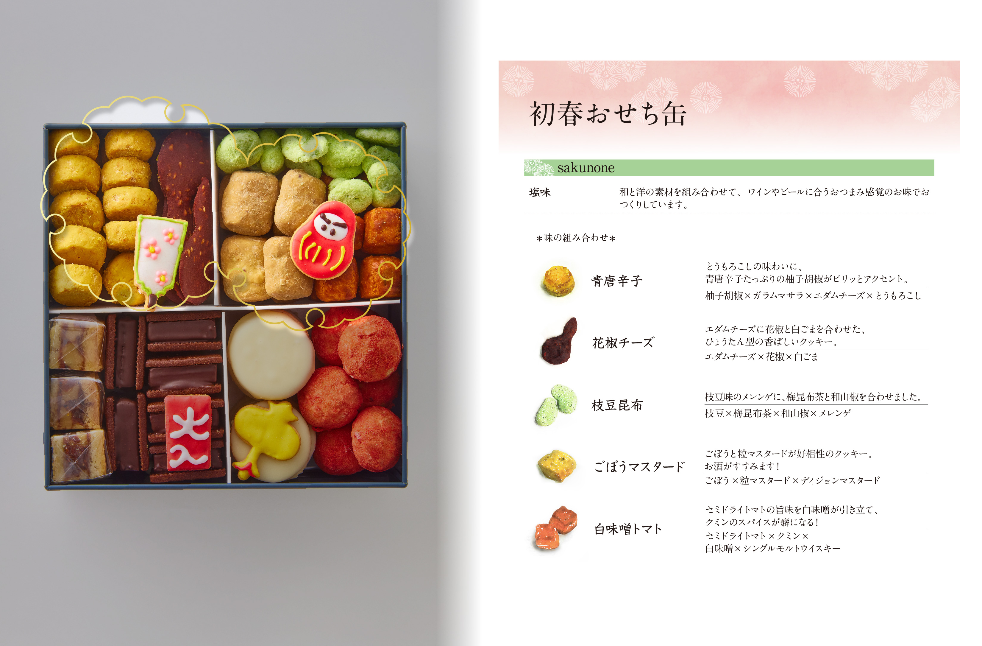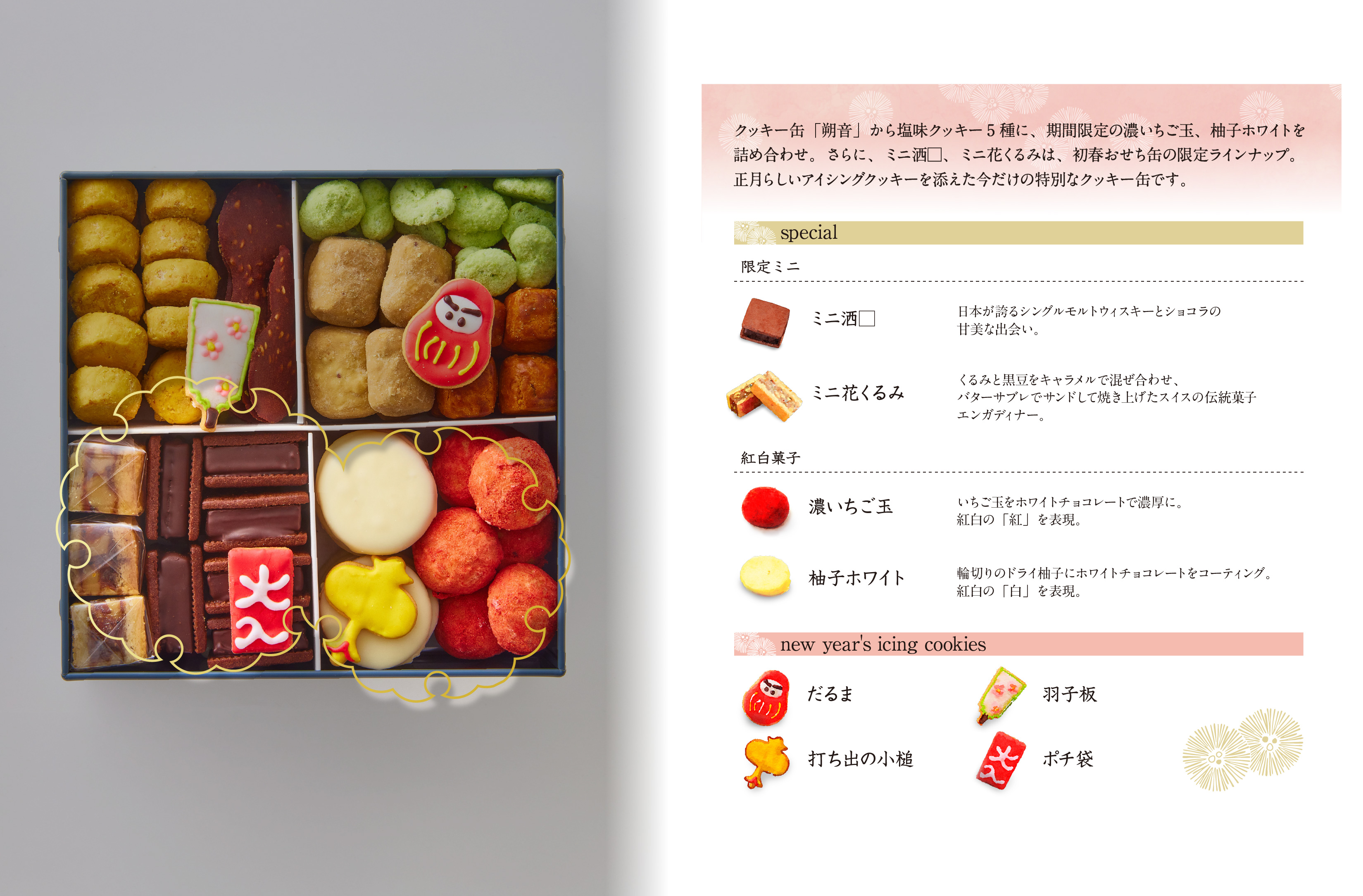 正月らしいアイシングクッキーを添えた今低糖質素材を使用した大人のためのクッキー缶「朔音」から塩味クッキー5種に、期間限定のリッチな濃いちご玉、柚子ショコラを詰め合わせました。さらに、ぎをんさかいの定番人気商品:洒口、花くるみのミニサイズは、初春おせち缶のみの詰め合わせ。正月らしいアイシングクッキーを添えた今だけの特別なクッキー缶です。